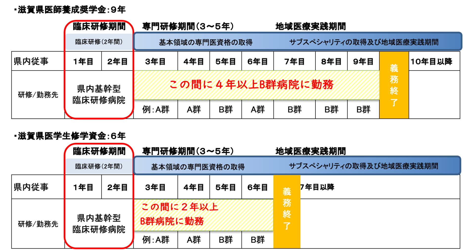 | B群 ※医師養成奨学金:9年は、4年間以上の勤務が必要(医学生修学資金:6年は2年間以上) |